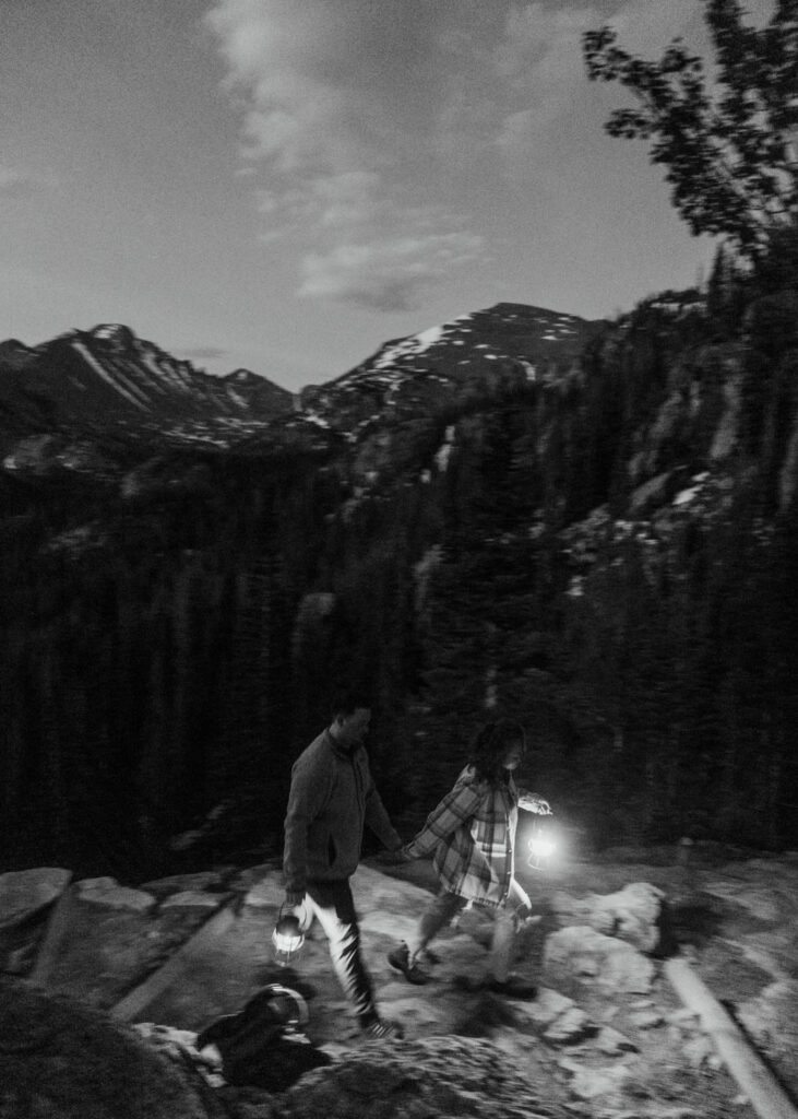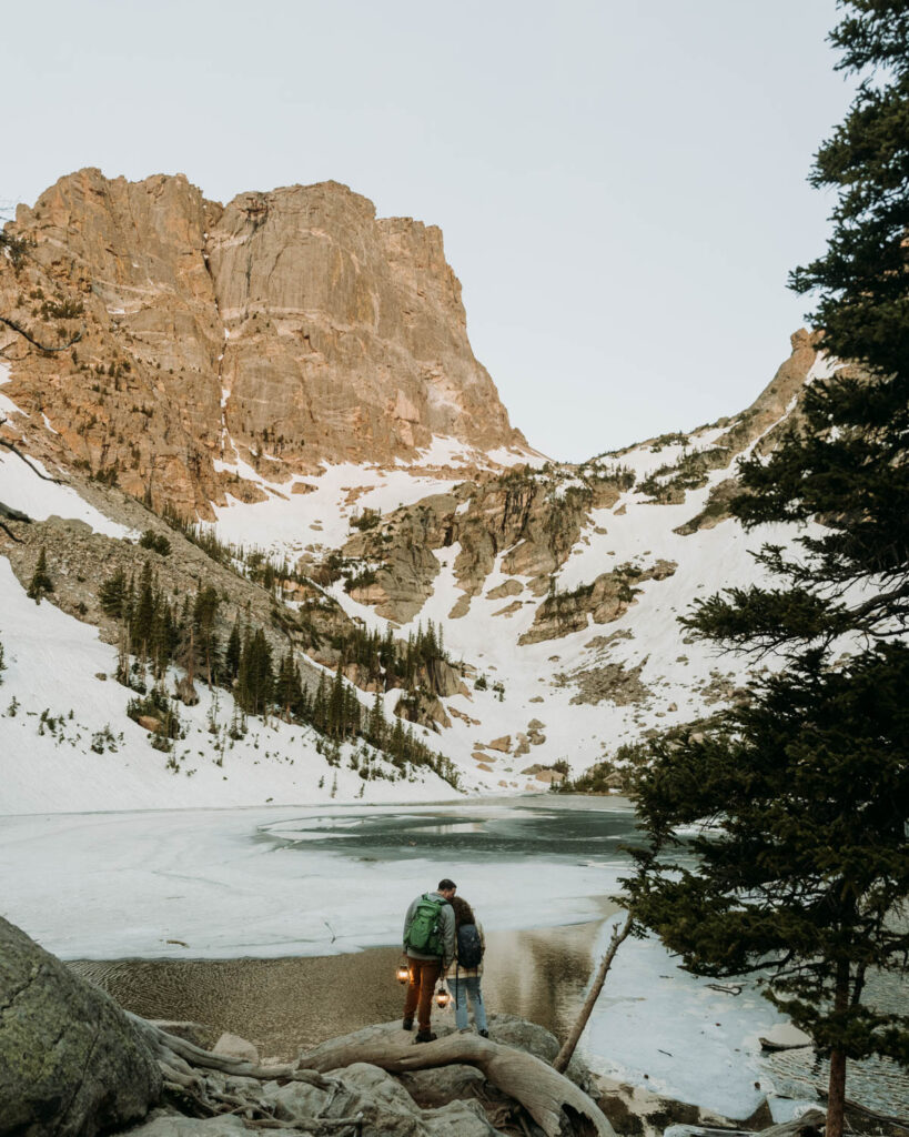 Their intentional Rocky Mountain elopement started before the sun even thought about rising, with a trail lit only by headlamps and the fading stars above. The wilderness belonged to them alone – no other voices, no distant hikers, just the sound of their footsteps and the mountain breathing around them. By the time alpenglow painted the peaks above Emerald Lake in shades of gold and rose, they were wrapped in that rare, sacred solitude that only comes when you’re the first ones out there.