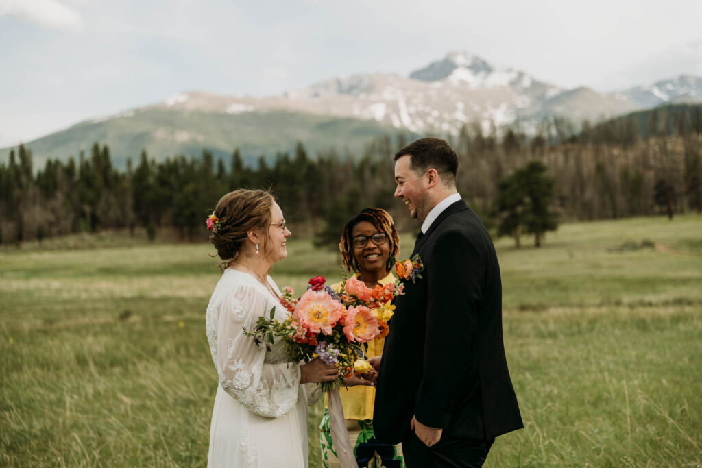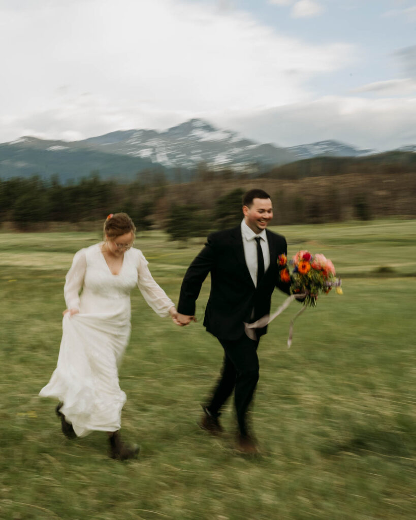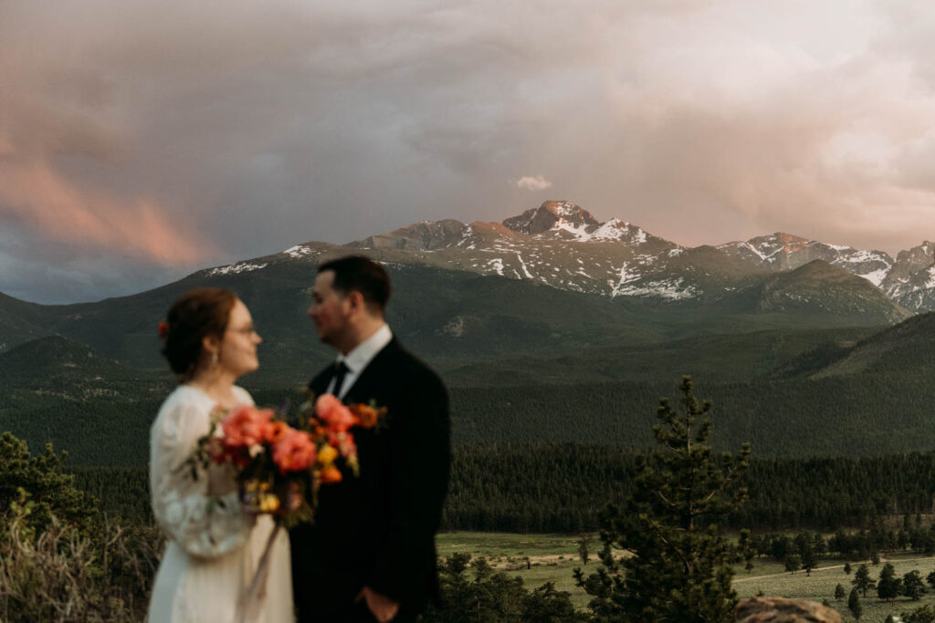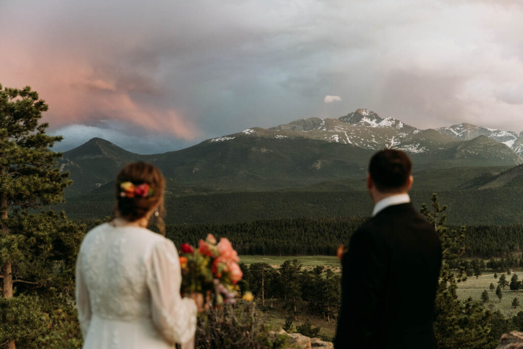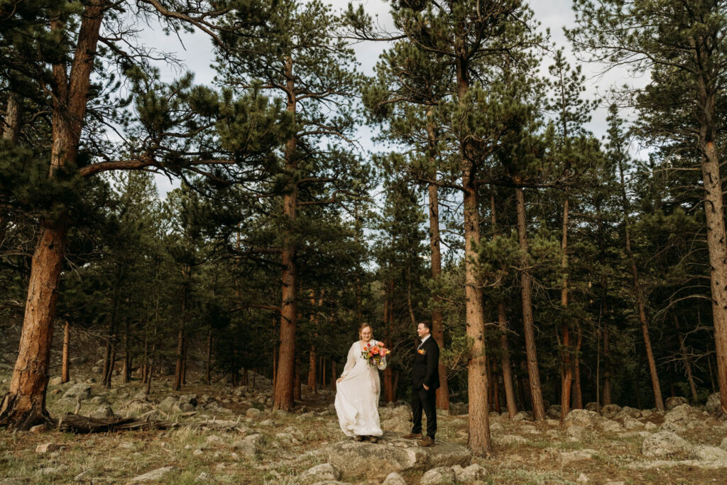 After the ceremony, we explored. We ran through the meadow as the light turned golden, wandered into the forest where the trees created their own cathedral, and chased the sunset as it painted the sky in shades of pink I’m still not sure were real. This is the magic of Rocky Mountain elopements in summer – the landscape holds so much variety, so many different feelings within just a few miles.